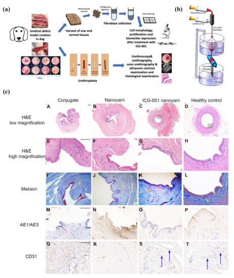 (a) Study design of using ICG-001 loaded collagen/poly(L-lactideco-caprolactone) nanoyarn to treat urethral defects in a canine model; (b) fabrication process of ICG-001 delivered collagen/poly(L-lactideco-caprolactone) nanoyarn; (c) hematoxylin and eosin (A–H), Masson trichrome (I–L), AE1/AE3 (M–P) and CD31 (Q–T) staining of urethras in each group at 12 weeks post urethroplasty. H&E, hematoxylin and eosin. Red arrows indicate the epithelium in (M,O,P). Blue arrows indicate vessels in (S,T). Yellow asterisks indicate ECM in (I–L). Adapted with permission from [143], published by Frontiers, 2020.
