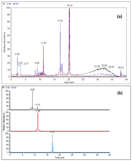 (a) LC-HR-MS full scan chromatograms of nirmatrelvir: standard solution (black), after 3 h at pH = 13 ± 0.2 (blue), after one week at pH = 1 ± 0.2 and at 40 °C (red). (b) Extracted ion chromatograms obtained from the full scan chromatogram recorder after 3 h at pH = 13 ± 0.2: black m/z [421.5–422.5] uma, red: m/z [403.5–404.5] uma, light blue: m/z [517.5–518.5] uma.