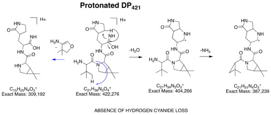 Proposed fragmentation pattern of protonated DP421 ([DP421+H]+).
