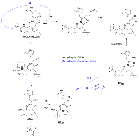 When exposed to basic conditions, the nitrile group of nirmatrelvir can be attacked as per path A proposed in Figure 6. Briefly, nucleophilic attack by hydroxide ions occurs on the carbon of the nitrile group, giving rise to an azanide intermediate, which then captures hydrogen from a water molecule. By tautomeric rearrangement, two forms of DP517 may coexist, amide or methanimidic acid derivative.