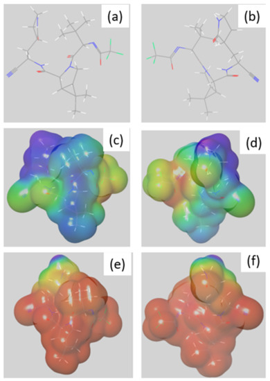 (a,b) Structure of optimized geometry of nirmatrelvir’s main conformer at pH = 13; (c,d) associated mapped electrostatic potential; and (e,f) mapped Fukui f + function. Regions with lowest and highest values are mapped in red and purple, respectively.