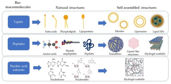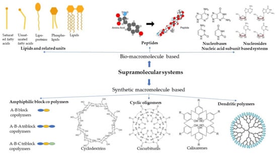 This category of supramolecular systems uses the advantage of natural biomimicry offered by the materials as they are also inherently synthesized and circulated amongst the cells and tissues. Based on the type of macromolecules used, it can be further classified into lipids, peptides, and nucleic acid-based systems, as illustrated in Figure 2.