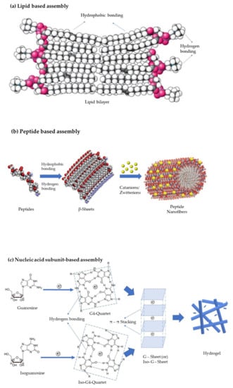 Nucleic acid subunit based self-assemblies: All the nucleic acid sub-components, namely nucleobases, nucleosides, and nucleotides, serve as supramolecular motifs in the construction of complex architectures via non-covalent interactions such as hydrogen bonding, electrostatic effects, π–π stacking, hydrophobic interactions, and metal coordination. Different structural properties endow them with varying binding abilities. Because of the non-covalent interactions between the components, the resulting assemblies have controllable morphology, physico-chemical properties, and stimuli responsiveness. Commonly used nucleosides for hydrogels are guanosine, Isoguanosine, and ureidopyrimidine, which form quartets by intermolecular hydrogen bonding [77,78]. The molecules in the quartet with the double bonds undergo π–π stacking to form G-Sheets or quadruplexes, as presented in Figure 4c. Such quadruplexes are further grouped to form hydrogels which can be used in regenerative medicine as a delivery vehicle and as a scaffold [79].