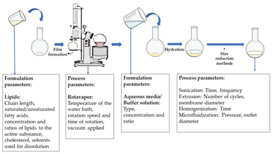 Schematic representation of the preparation of liposomes, highlighting the formulation and process parameters involved (created with Biorender.com [accessed on 30 June 2022]).
