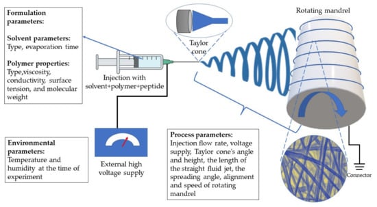 Parameters related to the polymer solution, process parameters, and environmental conditions affect the electrospinning process. The viscosity, conductivity, surface tension, and molecular weight of the polymer are all formulation factors that have a substantial impact on the morphology and size of the fibers. The process parameters are the applied electrical force, tip to distance collector, and feed/flow rate. The electrospinning process is also influenced by environmental circumstances, which include the temperature and humidity at which the operation is carried out, to avoid degradation of the peptides. In addition to these parameters, the formulation additives such as the type of organic solvent used to dissolve the peptides and to enhance the spinnability. To improve mechanical qualities, peptide/proteins can be combined with natural and synthetic polymers such as Eudragit®, poly-L-lactic acid (PLLA), polycaprolactone (PCL), chitosan, polylactic acid (PLA), and PEO. Morphology, fiber stability, decreased degradation in the physiological environment, increased biological function, and increased spinnability are examples of these features. Glutaraldehyde, formaldehyde, genipin, proanthocyanin, and chlorination are examples of cross-linkers that can be utilized for this purpose [95].
