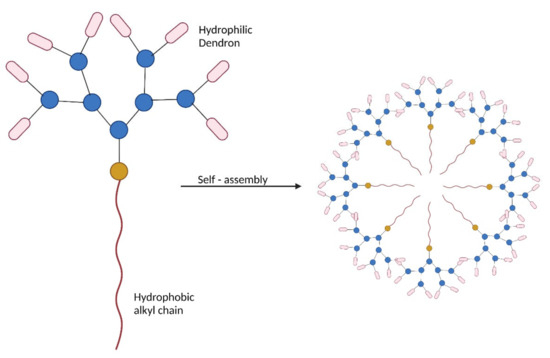 The dendrimers are either prepared by convergent or divergent methods consisting of a multifunctional central core with branching dendritic polymers involving the formation of covalent bonds. Due to this covalent synthesis, the higher generation of dendrimers, which have many branches, often has structural defects due to incomplete reactions. In the case of amphiphilic dendritic polymers, dendrons are also manufactured either by convergent or divergent methods. However, then the hydrophilic dendrons have hydrophobic alkyl chains that form the core by electrostatic and hydrophobic interactions. This problem could be overcome by the non-covalent synthesis using the amphiphilic dendritic polymers with hydrophobic alkyl chains and the hydrophilic dendrons consisting of PAMAM. The hydrophilic dendrons are directed towards the outer surface, while the hydrophobic alkyl chain is directed towards the center, as shown in Figure 7. The hydrophobic alkyl chains from various dendrons form the core by electrostatic and hydrophobic interactions [44].