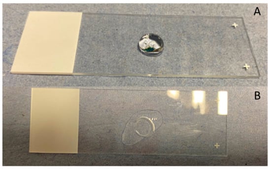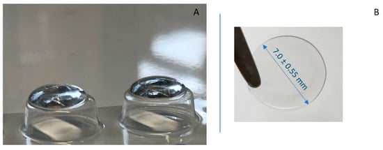 (A) 50 μL of the gel placed on the top of cylindrical blisters; (B) round, transparent film.