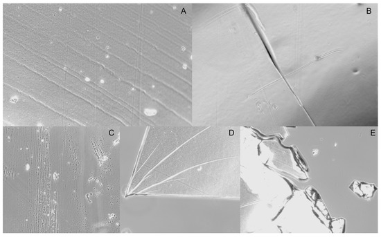 (A) F1 film surface before folding, (B) folding line without signs of crack on F1 surface, (C) F6 film surface before folding, (D) crack on F6 surface after one-fold-time, (E) F6 film fragments after cracking.