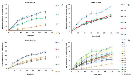 Permeation profiles through rabbit nasal mucosa for formulations containing 1% HPMC E50 (A), 2% HPMC E50 (B) and, 3% HPMC E50 (C), and for all tested formulations in comparison to the DH solution (D), expressed as % of loading dose (mean ± SΕ, n = 3).