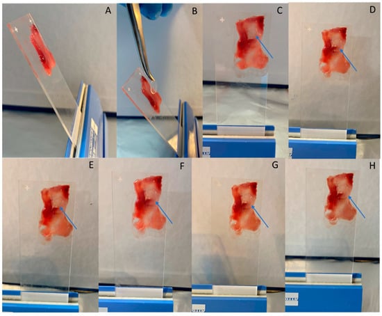 Evaluation of films’ mucoadhesive ability on nasal mucosa tissue positioned on glass slides in 60° degrees angle: (A) nasal mucosa, (B,C) Film positioning on nasal mucosa (blue arrow) at the time point of t = 0 min, (D) t = 30 s, (E) t = 5 min, (F) t = 30 min, (G) t = 60 min, (H) t = 120 min, after the positioning.
