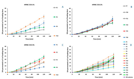 Nevertheless, when HPMC E50 was present at a 2% concentration (F7, F10, F11, F14–F16), no significant differences (p > 0.05) were observed among the formulations, at all of the time points. In Figure 6C, where showing permeation profiles for the formulations containing 3% of HPMC E50, it is noted that the contribution of the permeation enhancer is more pronounced.