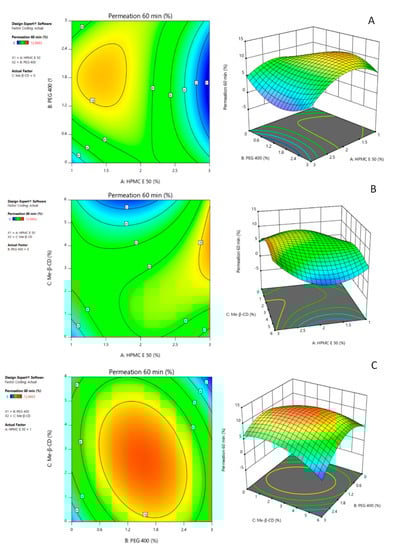 Effect of interactions (A) HPMC E50–PEG 400, (B) HPMC E50–Me-β-CD, (C) PEG 400–Me-β-CD, when HPMC E50 was kept constant at 1% w/w, on the permeation of DH across the rabbit nasal mucosa barrier, represented by the 2D contour plots (left panel) and 3D surface plots (right panel).