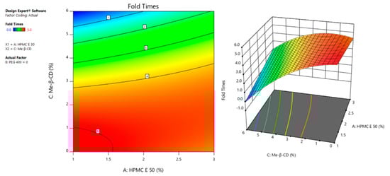 The results allow one to hypothesize the formation of an HPMC- Me-β-CD network, which results in films with higher flexibility, indicating the positive effect of AC interaction in response Y2 (Fold times). However, at higher concentration of factor C and lower concentration of factor A, the interaction acts negatively on response Y2 (Figure 8), either decreasing the flexibility (F6) or impeding film formation (F8, F17).