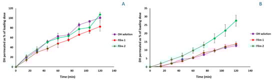 (A) Amount released and (B) permeation profiles for Films 1,2, in comparison with the DH solution, expressed as the % of loading dose (mean ± SD and mean ± SE, respectively, n = 3).