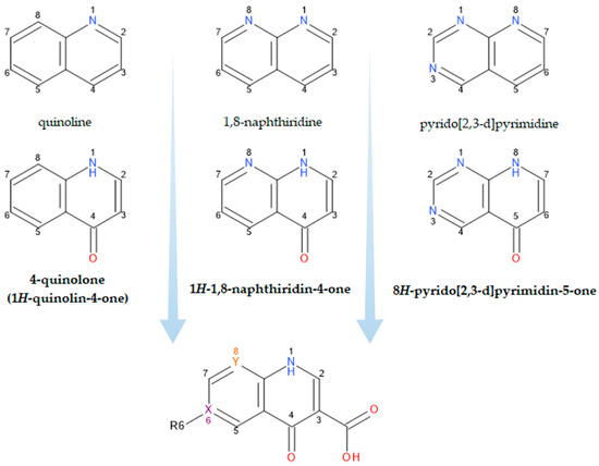 What we now generically term “quinolones” are, in fact, derivatives of either 4-quinolone, 1,8-naphthyridine-4-one, or pyrido-pyrimidine-5-one structures (Figure 1) [19,26].