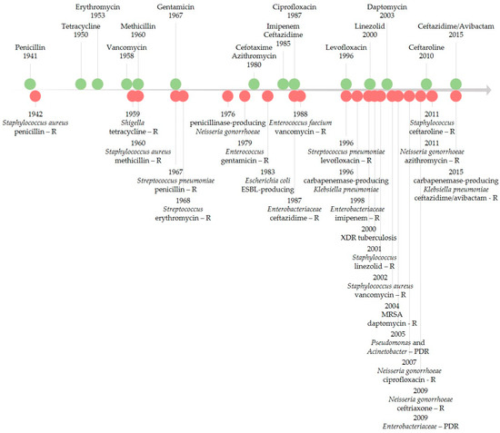 The evolution of identified resistance is in line with the introduction in the therapy of a few highlighted antibiotics [152,153].