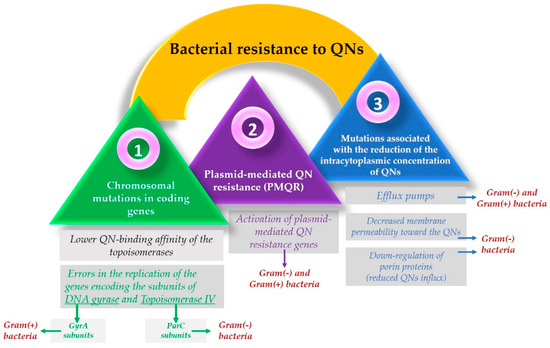 Resistance to FQNs occurs because bacteria use multiple mechanisms to adapt and survive when interacting with the drug [198,199]. One of the most used resistance mechanisms is the mutation of the genes that encode the type II Topoisomerases. This mechanism focuses on the alteration of the target site known as the quinolone resistance-determining region (QRDR) [130] and leads to a lower quinolone-binding affinity of the Topoisomerase enzymes [200]. Usually, concerning Gram-negative bacteria, FQNs affect the gyrase while in Gram-positive bacteria, FQNs target the Topoisomerase IV [197]. These mutations allow the bacteria to adapt after contact with the FQN [5]. So, as a result, it is considered that in Gram-negative bacteria, resistance occurs due to alterations in the DNA gyrase. In contrast, in Gram-positive bacteria, it is due to Topoisomerase IV mutations [201].