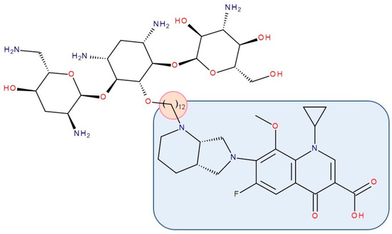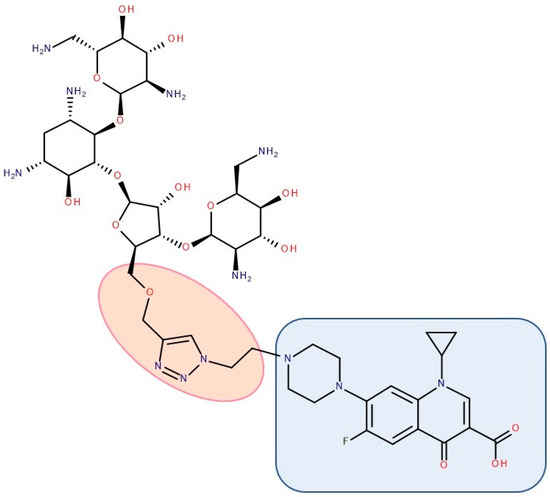 - Pokrovskaya, V.; Belakhov, V.; Hainrichson, M.; Yaron, S.; Baasov, T. Design, Synthesis, and Evaluation of Novel Fluoroquinolone−Aminoglycoside Hybrid Antibiotics. J. Med. Chem. 2009, 52, 2243–2254. [Google Scholar] [CrossRef]