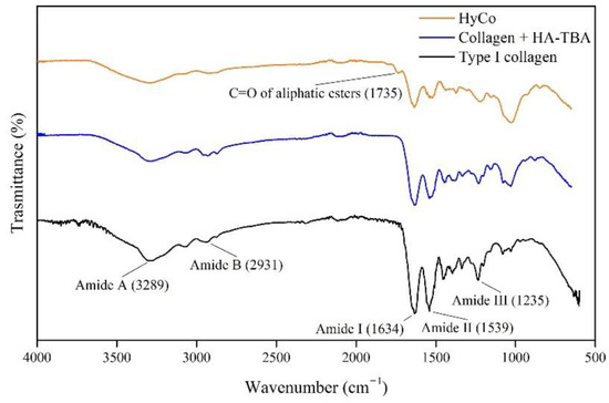 In the case of the HyCo, a new peak in correspondence of the wavenumber of 1735 cm−1 appeared. Furthermore, all bands associated with amides were decreased in intensity after crosslink reaction (see also Figure S2).