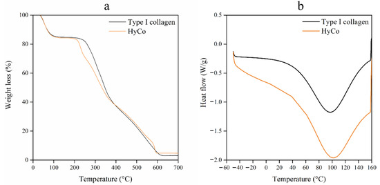TGA and DSC analyses of commercial collagen scaffold and HyCo. TGA thermograms within the warming range from 0 to 700 °C (a); DSC profiles were recorded using a calorimeter with samples shielded in aluminum containers in the temperature range of −50 °C and 160 °C in nitrogen atmosphere. The DSC scan shows an endothermic peak at 100 °C attributed to water loss/evaporation (b).