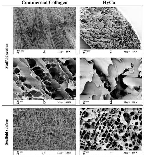 Comparison between SEM images of commercial equine type I collagen scaffold and HyCo. From the micrographs a different porosity and internal morphological organization of section and surface between commercial collagen (a,b,e) scaffold and HyCo one (c,d,f) is evident; however, both showed open and interconnected voids.