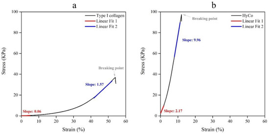 Stress–strain curves resulting from tensile tests of commercial collagen scaffold and HyCo and related Young’s Moduli. Type I collagen scaffold (a) and HyCo (b); HyCo scaffold displayed a significant statistical increase in both Young’s moduli with respect to the commercial collagen one. Slopes of straight lines were calculated on the linear portion of curves using least-squares fit on tensile test data by means OriginPro 2016 software (OriginLab, Northampton, MA, USA).