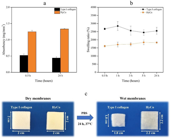 Absorbency and swelling ratio assays on commercial collagen scaffold and HyCo. Absorption capability of a saline solution (142 mM NaCl, 2.5 mM CaCl2) by collagen and HyCo scaffold at 30 min and 24 h expressed as mg/mm3 (a), and related swelling ratio (%) at different time points (b). Data are presented as mean ± standard error. Pictures are of dry samples and samples after 24 h of incubation with PBS at 37 °C (c).