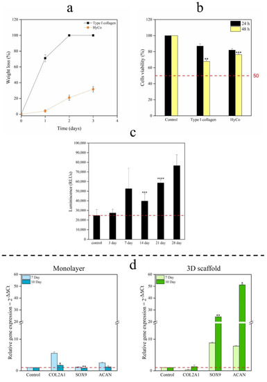 Degradation profiles of commercial collagen scaffold and HyCo, cytotoxicity study, and gene expression profiles. Comparison between enzymatic degradation of collagen and HyCo following treatment with collagenase from Clostridium hystolyticum, at 37 °C (a); Collagen and HyCo scaffolds cytotoxicity evaluated with human peripheral blood mononuclear cells (hPBMCs) by MTT assay: the histograms report the mean percentage of viable cells compared to controls of untreated cells (b). ATP activity of human chondrocytes cultured on HyCo scaffold for 28 days evaluated as mean of relative luminescence units compared to control. Experiments were analyzed by two-tailed Student’s t-test, * p ≤ 0.05, ** p < 0.01, *** p < 0.001 and **** p ≤ 0.0001; N = 3 (c); mRNA expression levels of chondrogenic markers (COL2A1, SOX9, and ACAN) of human chondrocytes cultured on 3D scaffold and 2D standard culture monitored by RT-qPCR; untreated cells at time zero were considered as control. * p < 0.05, ** p < 0.01 (two-way ANOVA). N = 3 biological replicates (d).