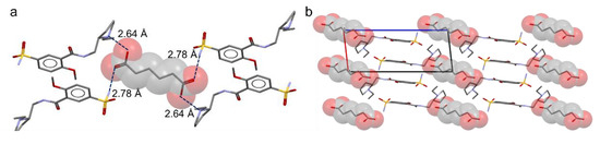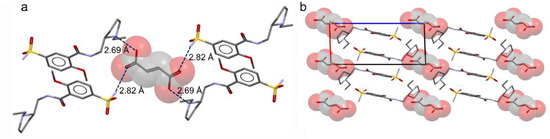 SULP-ADPA crystallizes in the space group in a 2:1 stoichiometric ratio. Each adipate ion bridges four symmetry-related hydrogenated SULP molecules through the pyrrolidine ring (N3···O8′/O10′ = 2.64(2) Å) and the NH2 group (N21···O7′/O9′ = 2.78(1) Å) (Figure 2a). The coformers are arranged within the crystal structure in alternated columns that run along the crystallographic b axis (Figure 2b). Additionally, the SULP molecules form symmetry-related dimers with the C=O of the amidic group interacting with the amine decoration of the adjacent molecules (N21···O11′ = 2.89(2) Å), thus forming an H-bond ring.