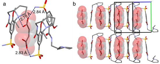 SULP-FA is isostructural with SULP-ADPA and crystallized in the space group in a 2:1 stoichiometric ratio (Figure 3a,b). The resulting interactions are N3···O6′/O8′ = 2.69(2) Å and N21···O5′/O7′ = 2.82(1) Å (Figure 3a). A symmetry-related SULP dimer as observed for SULP-ADPA is present (N21···O11′ = 2.98(2) Å), thus forming an H-bond ring.