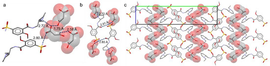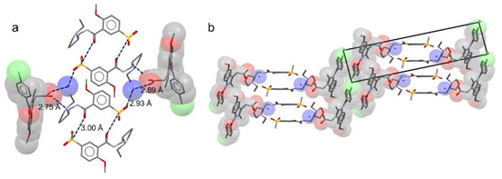 SULP-MLEA crystallizes in the space group in a 1:1 stoichiometric ratio (Figure 4a,b). Hydrogenated SULP and maleate counterions are arranged in columns that run along the crystallographic a axis in an alternated fashion within the crystal structure, as observed in Figure 4b. The N3···O6′ distance is 2.78(3) Å. Each maleate moiety bridges two additional hydrogenated SULP molecules (Figure 4a) via an H-bond through their NH2 group (N21···O7′ = 2.83(1) Å and N21···O5′ = 2.84(2) Å, respectively). No significant intermolecular homomeric interactions among SULP molecules are observed.