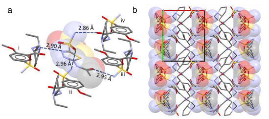 SULP-AZA crystallized in the space group in a 1:1 stoichiometric ratio. AZA is largely decorated with H-bond donor and acceptor groups; thus, it is surrounded by four SULP molecules, labelled from i to iv in Figure 7a. SULP i interacts through its pyrrolidinic ring with the thiadiazole ring of its counterion (N3···N7′ = 2.90(4) Å). SULP ii and iii both interact with their SNH2 group, respectively, with the S=O (N21···O10′ 2.96(3) Å) and amidic C=O (N21···O3′ = 2.95(2) Å) groups of the AZA. SULP iv acted as an H-bond acceptor through its C=O amidic group with the SNH2 (O11···N13′ = 2.86(5) Å) of the AZA molecules. An intramolecular S(6) ring is also present in the SULP molecule (N9···O14 = 2.63(4) Å. Coformers are arranged in columns that run along the crystallographic b axis (Figure 7b).