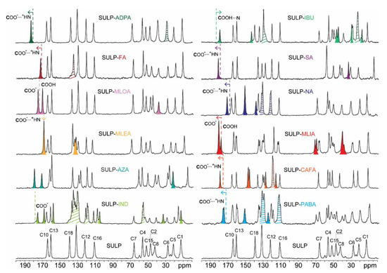 13C (100 MHz) CPMAS spectra of SULP (with assignment) and of all the 12 achieved adducts, acquired with a spinning speed of 12 kHz at room temperature. The COOH signals of the pure coformers are represented by the colored dashed lines in each spectrum to highlight the shift undergone upon cocrystallization. Colored peaks represent signals ascribable to the coformer. Striped peaks result from the overlap of coformer signals with those of SULP. The numbering of the SULP atoms refers to Scheme 1.