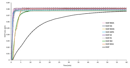 Dissolution profiles of pure SULP (black) and adducts: SULP-ADPA (light blue), SULP-FA (grey), SULP-MLEA (pink), SULP-MLIA (orange), SULP-MLOA (yellow), SULP-NA (blue), SULP-SA (purple), SULP-IBU (green).