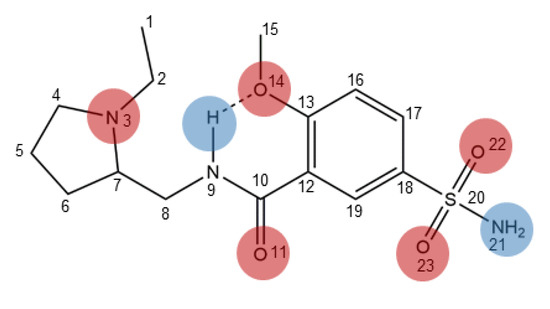 Chemical structure of SULP with atom numbering. The main functional groups available for supramolecular interactions are highlighted in red (H-bond acceptors) and blue (H-bond donors).