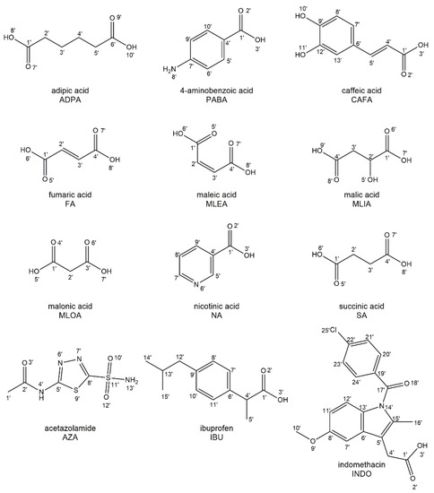 The coformers chosen for the design of the adducts are mainly GRAS [18] (Generally Recognized As Safe) molecules widely employed in both food and pharmaceuticals, and often introduced in drug formulations as excipients. Specifically, the coformers are adipic acid (ADPA), 4-aminobenzoic acid (PABA), caffeic acid (CAFA), fumaric acid (FA), maleic acid (MLEA), malic acid (MLIA), malonic acid (MLOA), nicotinic acid (NA), succinic acid (SA) and the active ingredients are acetazolamide (AZA), ibuprofen (IBU), and indomethacin (IND), see Scheme 2. Among the selected coformers, some are of particular interest not only for the possibility of forming a supramolecular adduct but also for their health benefits [19]. For example, NA is a member of the water-soluble B-vitamin family, and its use results in the reduction of the number of blood lipids and in the risk of myocardial infarctions [20]. Differently, SA is administered as a dietary supplement, particularly for the treatment of dietary deficiencies and imbalances, and CAFA has antioxidant properties that protect against free radical-induced DNA damage [21]. Further, several selected coformers are currently used as pharmaceutical excipients (e.g., ADPA, MLIA, FA, and MLEA), mainly as acidifying, buffering, and flavoring agents.