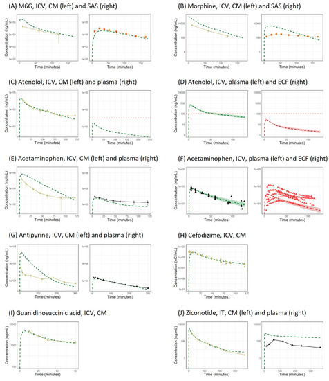 In addition, large interindividual variability in the ECF concentrations of acetaminophen after ICV administration (Figure 4F) [22] can be attributed to the differences in spatial positions of microdialysis probes, as confirmed in [62]. Three-dimensional modeling approaches [63] can allow the precise description of such local PK profiles.