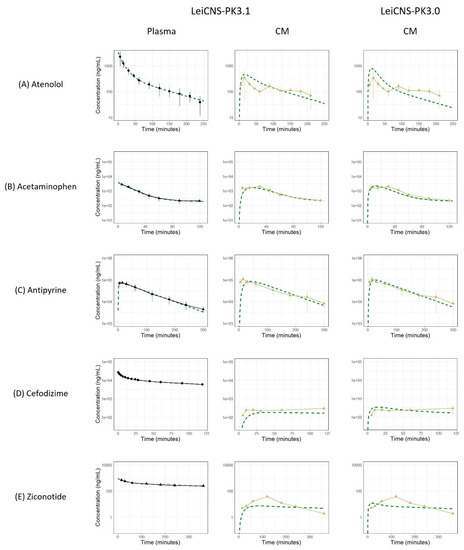 Similarly, the addition of periventricular CL clearly improved the description of the CM PK profiles of acetaminophen and antipyrine (Supplementary Materials Figure S3) after ICV administration, possibly indicating their distribution to the periventricular parenchymal tissue and subsequent elimination across the BBB. These results indicate that the original QCSF in the LeiCNS-PK3.0 model were fast enough to describe the CM PK profiles of these two drugs relatively well (Supplementary Materials Figure S1I,K).