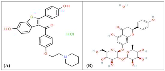 The chemical structure of (A) raloxifene and (B) naringin.