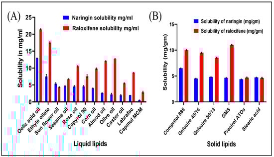 Solubility profiles of RLX and NRG in (A) liquid lipids (at 25 °C) and (B) solid lipids.