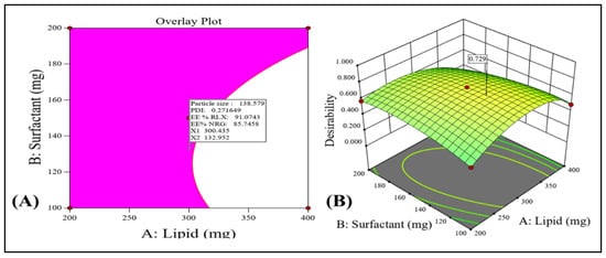 The best composition of the NLCs formulation is to be determined by a thorough optimization technique. According to the chosen quadratic model, the numerical and graphical optimization methodology was used with the goal of optimization of all the output parameters such as the minimum particle size for better RLX/NRG NLCs’ absorption, low values of the PDI for maintaining RLX/NRG NLCs’ homogeneity and stability, and high drug entrapment efficiency for better therapeutic activity of the RLX and NRG loaded in NLCs. Figure 4A,B shows the overlay diagram obtained throughout the graphical optimization, which displays the anticipated values of the input variables for the optimized RLX/NRG NLCs composed of a total lipid weight of 300.43 mg, a surfactant weight of 132.95 mg, and sonication time (3 min) with statistically predicted value responses, viz., particle size of 138.579 nm, PDI of 0.271 mV, RLX entrapment efficiency of 91.07%, and NRG entrapment efficiency of 85.74% with an overall desirability function value of 0.729. It was found that the prediction error was less than 5% when the anticipated and reported values were compared, proving the model’s appropriateness and accuracy.