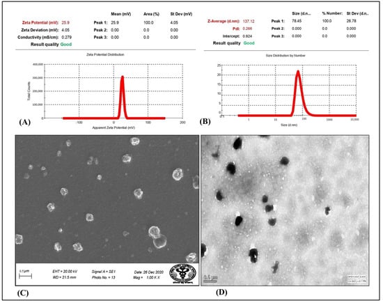 The assessment of particle size revealed that all of the prepared formulations had particle sizes ranging between 115.6 and 169.02 nm in size. The particle size distribution of the optimized RLX/NRG NLCs with a size of 137.12 nm and a particle size distribution index (PDI) of 0.266 are depicted in Figure 6A. The results demonstrated the monodisperse nature of the prepared RLX/NRG NLCs formulations. Moreover, it was discovered that the prepared NLCs formulations had positive electrical charges on their surfaces, which can be displayed as ZP (ζ), with values of +25.9 mV. The values of ZP in Figure 6B indicate that the prepared RLX/NRG NLCs have a relatively long duration of stability.