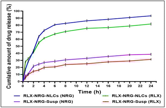 To conduct in vitro drug release studies, the activated dialysis tube membrane system (12 KDa, Himedia Ltd., New Delhi, India) was employed [46]. In short, a weighted quantity of drug-containing RLX/NRG NLCs and the RLX/NRG suspension was inserted in the dialysis tube and dipped into 80 mL dissolution media (0.1 N HCl, pH 1.2, for 2 h) and phosphate buffer (6.8 g of KH2PO4 and 0.94 g of NaOH dissolved in 1 L distilled water to give pH 6.8, for the remaining 22 h). An amount of 0.2% v/v Tween 80 was also added to the dissolution medium to ensure the sink condition. After a specified period, the samples (5 mL) were extracted and immediately replaced with an equal amount of fresh dissolution medium to maintain the sink condition. The samples filtered were later tested using a validated UV spectrophotometric technique (Vierordt’s method) (UV-1700, Shimadzu, Tokyo, Japan). The data were shown as a cumulative percentage of RLX and NRG release with respect to time.