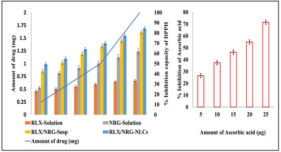 The radical scavenging potential of the ethanolic solution of RLX, NRG, RLX/NRG, and RLX/NRG NLCs were evaluated by radical DPPH and compared to that of a standard ascorbic acid solution. The evaluation was based on the DPPH’s potential activity in scavenging free radicals. Briefly, the activity of DPPH as a radical scavenger was determined using a modified technique developed by Kumar et al. [48]. A 2 mL solution of 0.04% w/v solution of DPPH in ethanol was added to 2 mL of various concentrations of RLX, NRG, RLX/NRG, and RLX/NRG NLCs, and the reaction mixture was kept for 45 min in a dark area at 25 °C. UV spectrophotometric measurements were taken at 517 nm to determine the absorbance of the tested samples and the DPPH solution. The DPPH scavenging capacity percentage was determined using Equation (3) and taking absorbance of DPPH as a control.