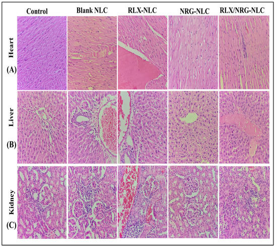 To evaluate the pharmacological safety of the prepared NLC nanoformulations, acute repeated toxicity studies were carried out by administering the tested drug-loaded nanoformulations at their therapeutic dose [54]. This study was carried out on female Wistar rats following the guidelines of the Organization for Economic Co-operation and Development (OECD). The rats were randomly selected and assigned to the following five test groups (six animals per group) and treated with normal saline, blank NLCs (2 mL), RLX NLCs, NRG NLCs, and RLX/NRG NLCs at their therapeutic doses of RLX (30 mg/kg) and NRG (40 mg/kg) via the oral gavage route daily for 14 days. Throughout the study, all the animals were monitored daily for clinical indicators of toxicity, mortality, and behavioral abnormalities, as well as changes in physical appearance, injury, pain, and signs of sickness. Bodyweight was recorded during pretreatment and during the post-treatment period. On the 15th day, the rats were anesthetized with ketamine–xylazine (75–10 mg/kg body weight i.p.), and blood samples were collected via a heart puncture into EDTA tubes, as previously described [55]. The collected blood was used for hematological analysis. Then, the rats were euthanized and the vital organs (liver, heart, and kidneys) were collected, cleaned in normal saline, and placed in 10% formalin; then, the samples were dehydrated with ethanol and embedded in paraffin blocks; thereafter, the tissues were mounted on glass slides and cut into thin sections of around 6 µm using a rotary microtome (Leica Multicut 2045, Reichert-Jung Products, Wetzlar, Germany). After histological staining with hematoxylin and eosin (HE), the slides were studied using a light microscope (ZEISS Primostar, Oberkochen, Germany) to monitor for any significant morphological changes. Photomicrographs of tissue sections from the test and control groups were recorded by a consultant histopathologist who documented the pathological differences in histological sections.