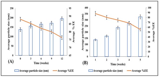 The impact of stability conditions on the particle size and average entrapment efficacy of the optimized lyophilized RLX/NRG-loaded NLCs at 3 months at (A) 25 ± 2 °C/60 ± 5% RH and (B) 40 ± 2 °C/75 ± 5% RH.