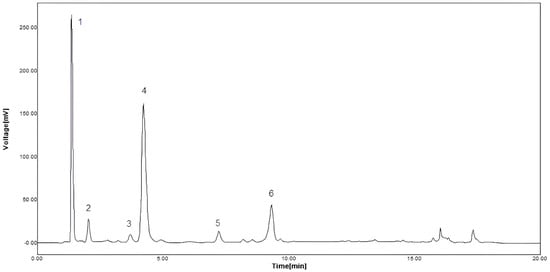 HPLC chromatogram of the grape skin extract after acid-catalyzed depolymerization. The main compounds identified are: (1) phloroglucinol, (2) EGC-P: (─) epigallocatechin- phloroglucinol, (3) C-P: (+)-catechin-phloroglucinol, (4) EC-P: (─)-epicatechin-phloroglucinol, (5) C: (+)-catechin, and (6) ECG-P: (−)-epicatechin gallate phloroglucinol []. Reprinted from LWT-Food Science and Technology, 44, Inhibition of the angiotensin-converting enzyme by grape seed and skin proanthocyanidins extracted from Vitis vinífera L. cv. País, Authors: Gonzalo Eriz, Verónica Sanhueza, Marlene Roeckel, Katherina Fernández with permission from Elsevier (2011).