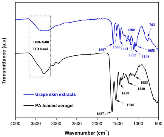 ATR-FTIR spectra of grape skin extract and PA-loaded aerogel showing their main functional groups.