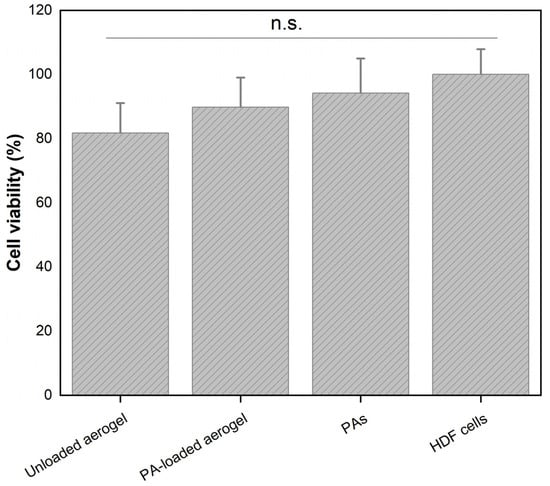 In vitro cell viability values for PAs and aerogels evaluated on HDF cells. Data correspond to mean ± SD value (n = 6, n.s.: non-significant statistical differences, p-value < 0.05).
