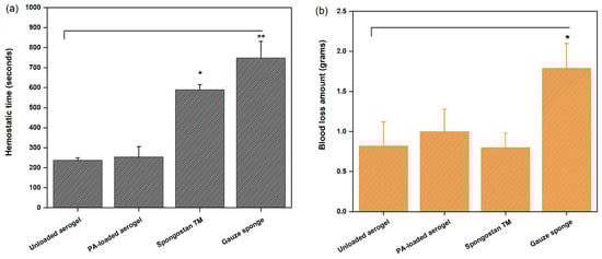 (a) Hemostatic times and (b) blood loss amounts, both measured during the in vivo assay for PA-loaded aerogel, unloaded aerogel, SpongostanTM and control gauze sponge. * p ≤ 0.05, ** p ≤ 0.01.